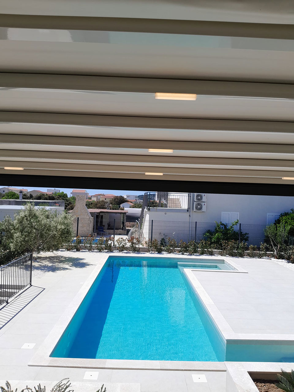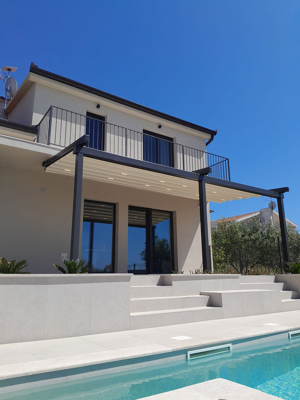 Pergola savršeno nadopunjuje prostor uz bazen te stvara ugodnu zonu za odmor, druženje i uživanje na otvorenom. Ovo rješenje posebno je pogodno za turističke objekte, vile i apartmane na obali.